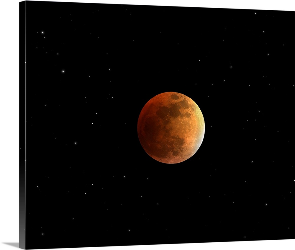 <p>Total lunar eclipse. This event occurs when the Earth moves between the Sun and the Moon. The orange colour of the Moon (sunlight reflected from the Moon after passing through the Earth's atmosphere) is due to shorter wavelengths, such as blue light, being scattered more in Earth's atmosphere than longer wavelengths, such as red light. Photographed on 28 September 2015.</p>