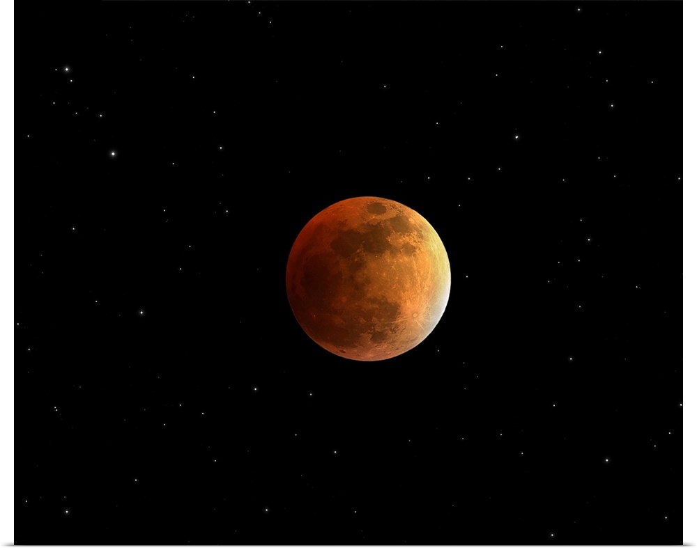 <p>Total lunar eclipse. This event occurs when the Earth moves between the Sun and the Moon. The orange colour of the Moon (sunlight reflected from the Moon after passing through the Earth's atmosphere) is due to shorter wavelengths, such as blue light, being scattered more in Earth's atmosphere than longer wavelengths, such as red light. Photographed on 28 September 2015.</p>