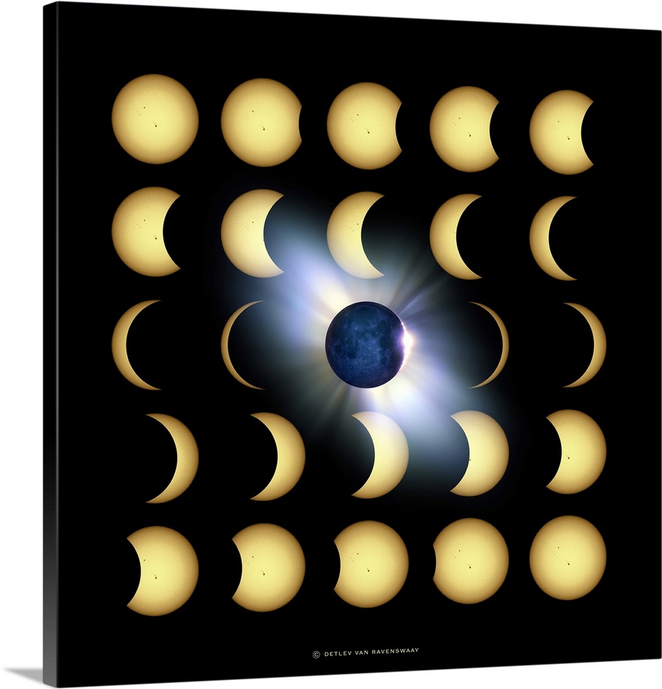 <p>Total solar eclipse. Computer artwork of the stages before and after a total solar eclipse (centre). The outer corona (white) is seen here, the cloud of low-density plasma (hot ions) that surrounds the Sun but is normally obscured by the brightness of the Sun's visible surface. A solar eclipse occurs when the Moon moves in front of the Sun and obscures its surface. This moment of totality lasts for only a few minutes. Total solar eclipses usually occur less than once a year, and can only be seen from a small area of the Earth's surface.</p>