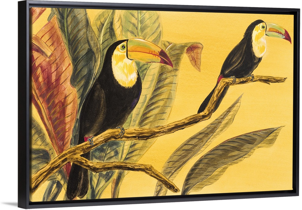 <p>Contemporary artwork of toucans perched on a branch.</p>