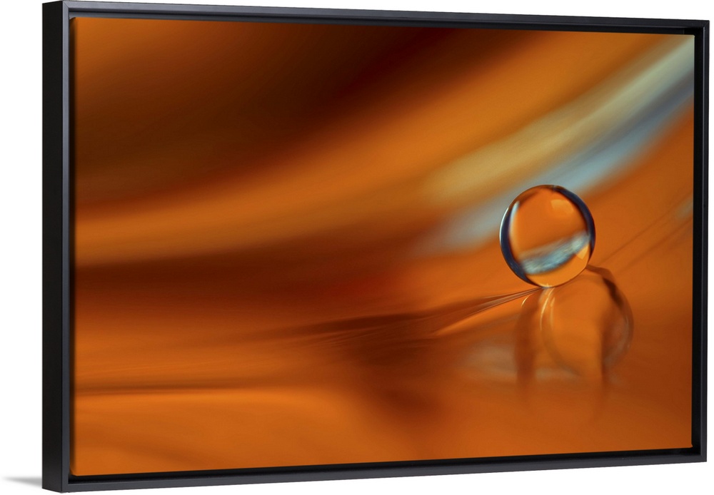 <p>A macro photograph of a water droplet sitting on an orange surface.</p>