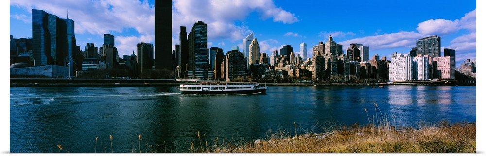 <p>Tourboat moving in river, East River, Manhattan, New York City, New York State, USA</p>