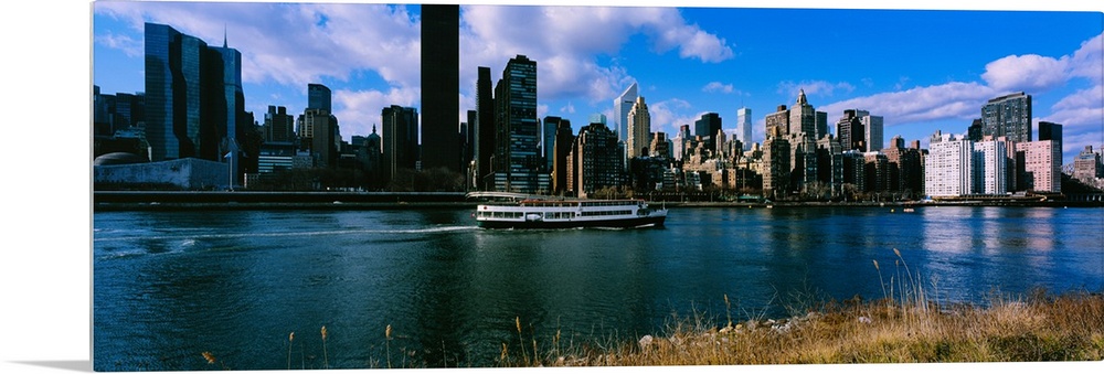 <p>Tourboat moving in river, East River, Manhattan, New York City, New York State, USA</p>
