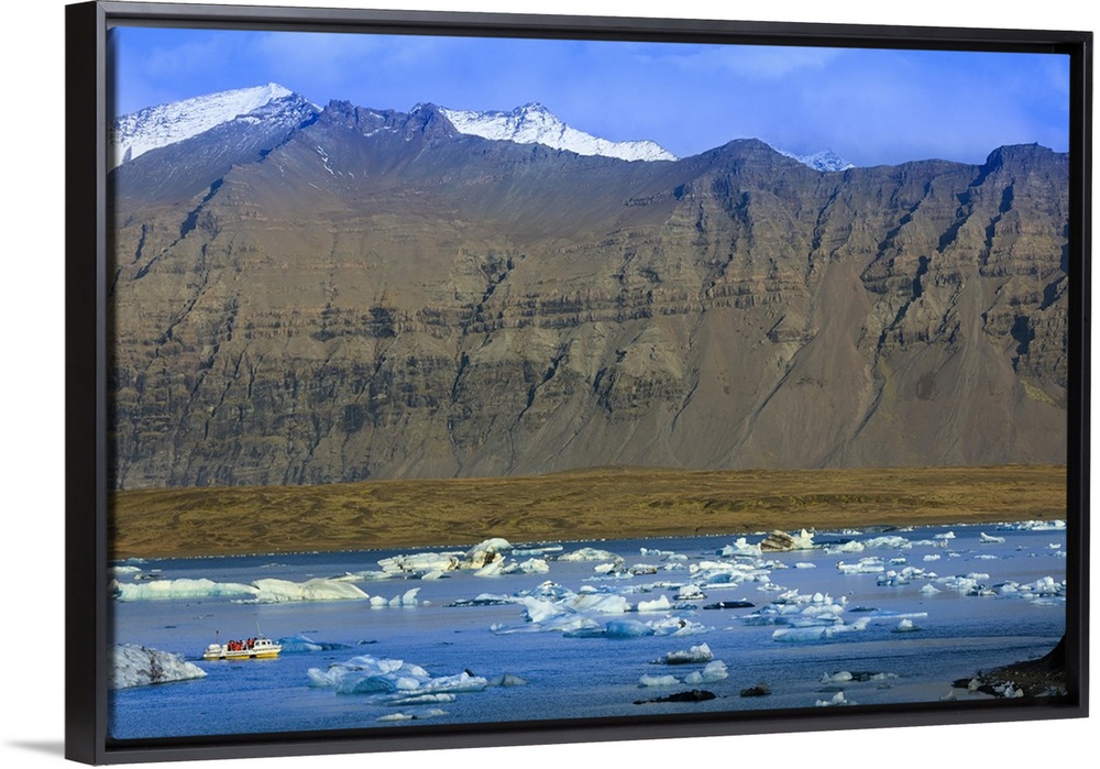 <p>Tourist boat in icebergs in the Jokulsarlon glacial lake in Vatnajokull National Park in southeast Iceland, Polar Regions</p>