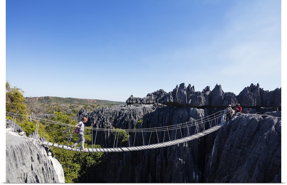 <p>Tourist crossing a rope bridge, Grand Tsingy, Tsingy du Bemaraha National Park, UNESCO World Heritage Site, western area, Madagascar, Africa</p>
