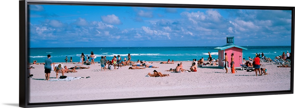 <p>Long horizontal print of people out and about on the beach with crashing waves behind them.</p>