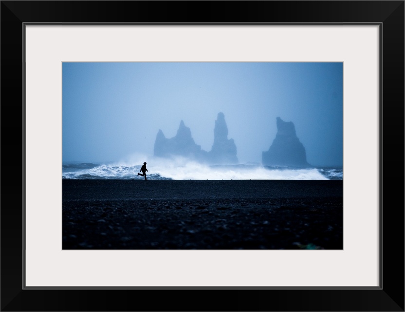 <p>Tourist running on Black Sand Beach, Iceland</p>