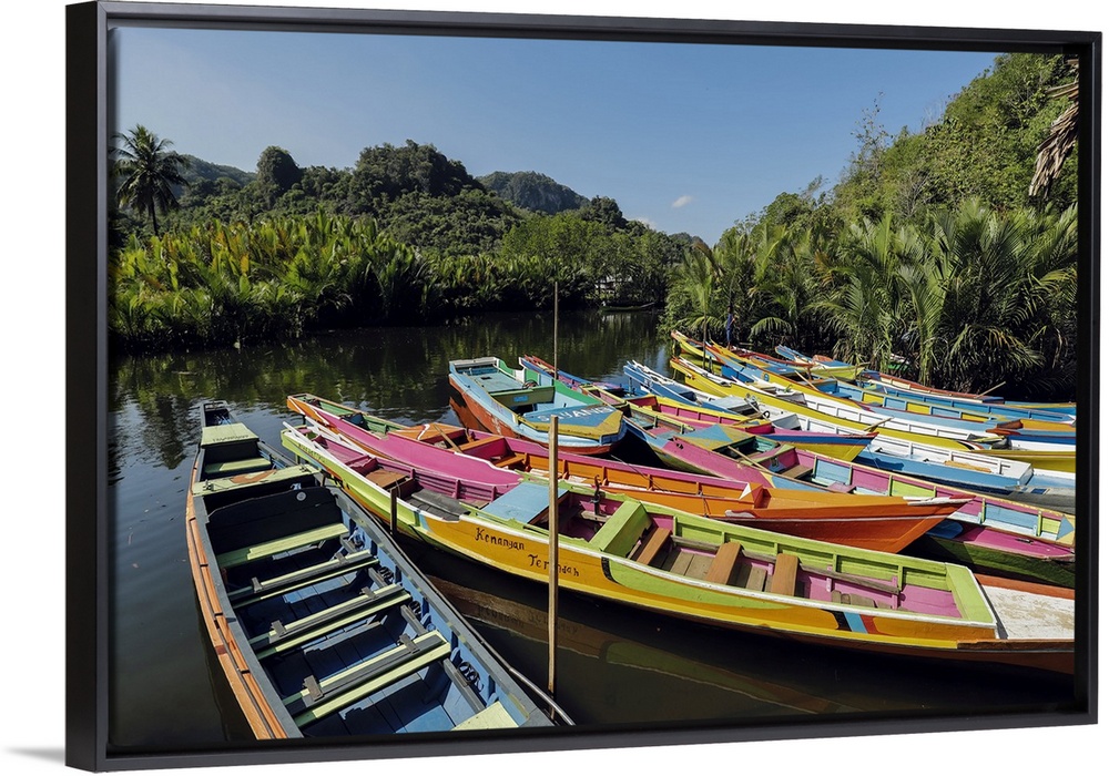 <p>Tourist tour boats on Pute River in karst limestone region, Rammang-Rammang, Maros, South Sulawesi, Indonesia, Southeast Asia, Asia</p>
