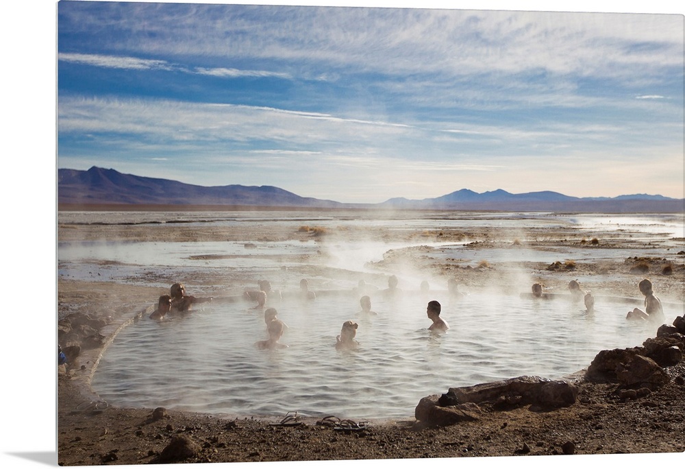 <p>Tourists enjoying natural hot springs in Bolivia's altiplano.</p>