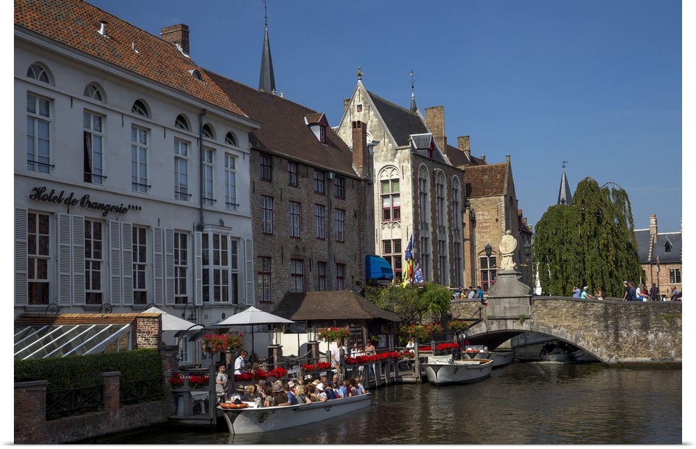 <p>Tourists in boats travel on the Den Dijver canal in summer, Bruges, West Flanders, Belgium, Europe</p>