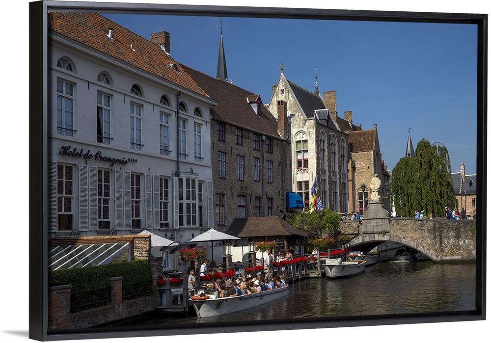 <p>Tourists in boats travel on the Den Dijver canal in summer, Bruges, West Flanders, Belgium, Europe</p>