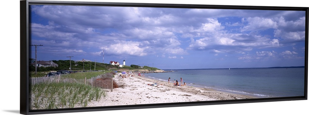 <p>A wide angle photograph is taken of a beach in Cape Cod that only has a few people on it. A light house can be seen in the distance.</p>