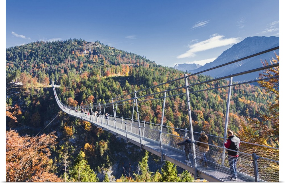 <p>Tourists on the suspension bridge called Highline 179 framed by colorful woods in autumn, Ehrenberg Castle, Reutte, Austria</p>