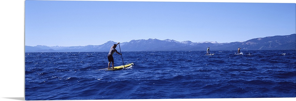 <p>Tourists paddle boarding in a lake, Lake Tahoe, California, USA</p>