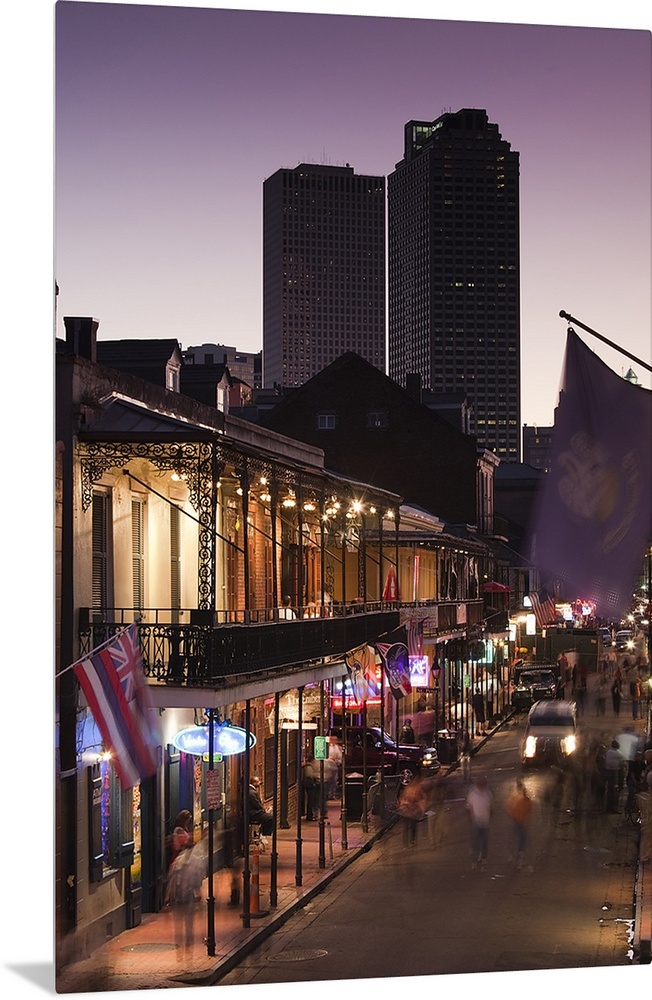 <p>People stroll down Bourbon Street in the French Quarter in New Orleans, Louisianna (LA) at dusk with skyscrapers looming in the distance.</p>
