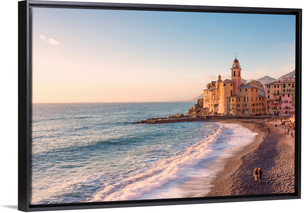 <p>Tourists walking on the beach of Camogli at sunset, Gulf of Paradise, Portofino National Park, Genoa province, Liguria, Italy.</p>