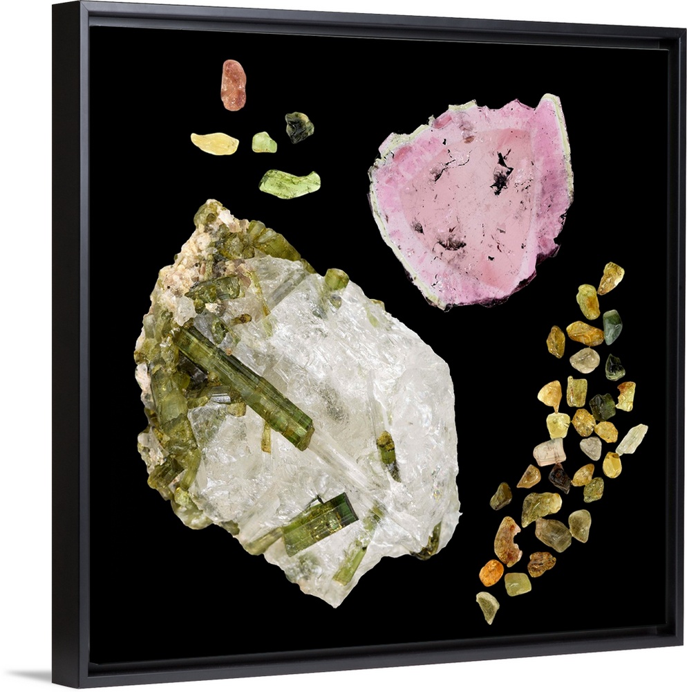 <p>Tourmaline. The specimen at bottom left is in its natural state, the other specimens have been polished. Tourmaline is a silicate mineral that can occur in several colours.</p>