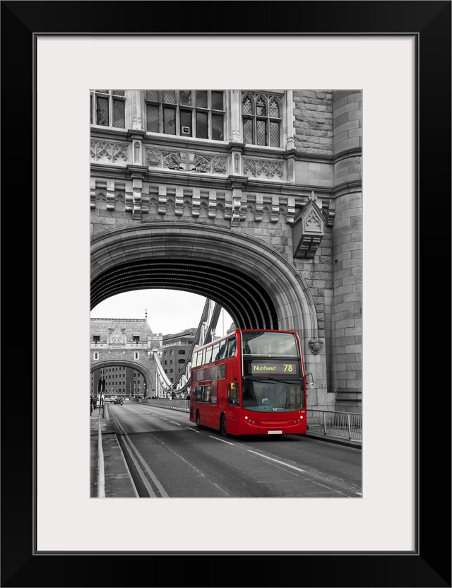 <p>Red London bus passing over Tower Bridge in black and white with selective color.</p>