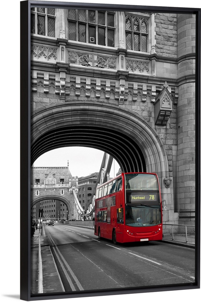 <p>Red London bus passing over Tower Bridge in black and white with selective color.</p>