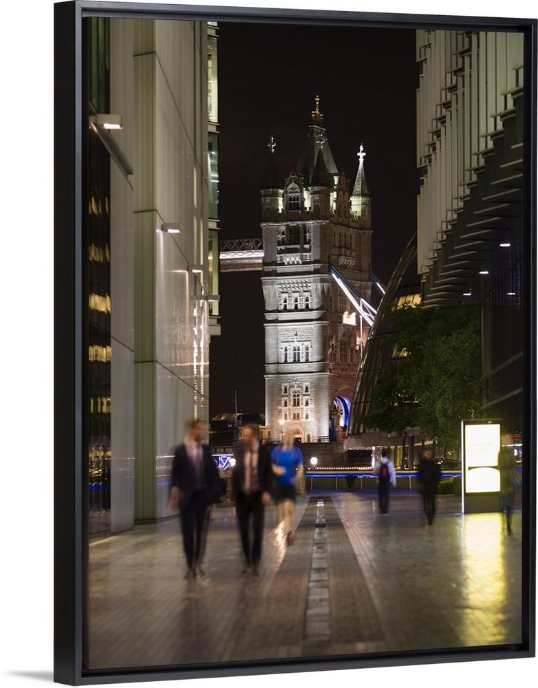 <p>Photograph of one of the two towers on Tower Bridge seen through a London cityscape at night.</p>