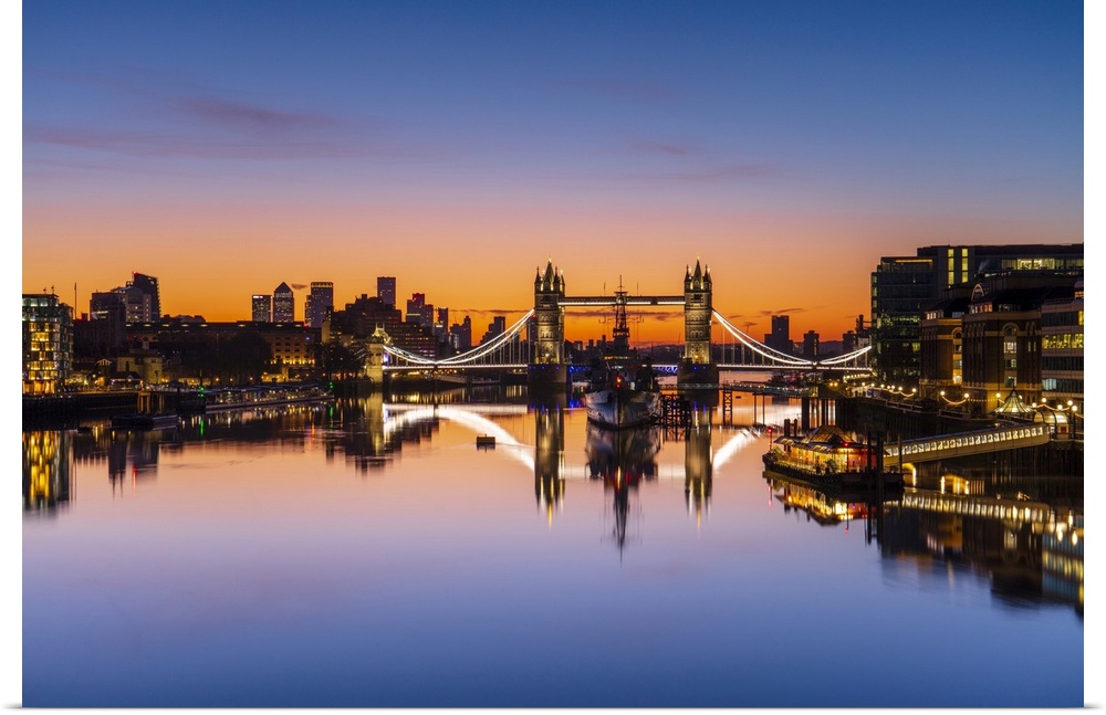 <p>Tower Bridge, HMS Belfast and reflections in a still River Thames at sunrise, London, England, United Kingdom, Europe</p>