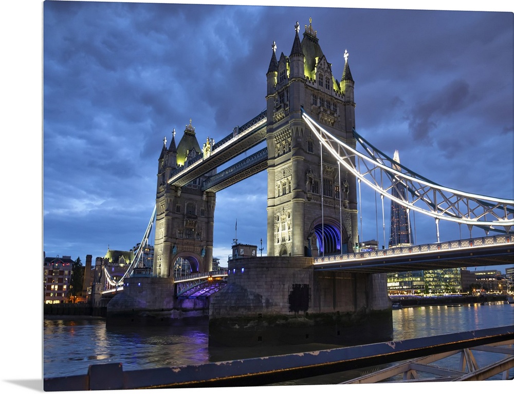 <p>Tower Bridge illuminated at dusk and reflected in the tranquil water of the River Thames; London, England.</p>