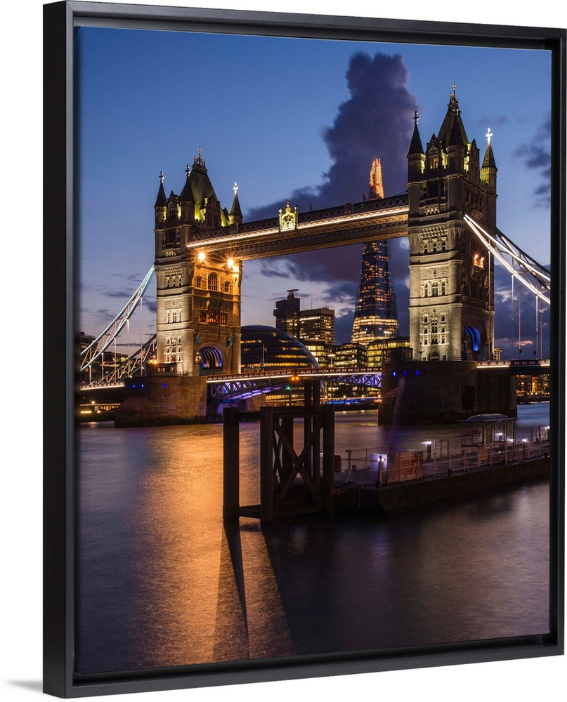 <p>Photograph of Tower Bridge over River Thames with the Shard Building in the background, all lit up at night.</p>