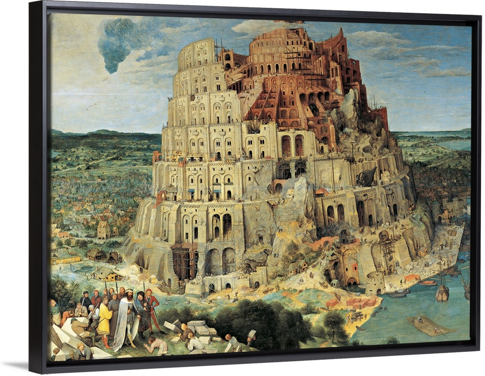 <p>The Tower of Babel, by Pieter il Vecchio Bruegel, 1563, 16th Century, oil on panel, cm 114 x 155 - Austria, Wien, Kunsthistorisches Museum. All. Tower of Babel concentric pillars architectural elements scaffolding arches structure landscape sea plain figu</p>