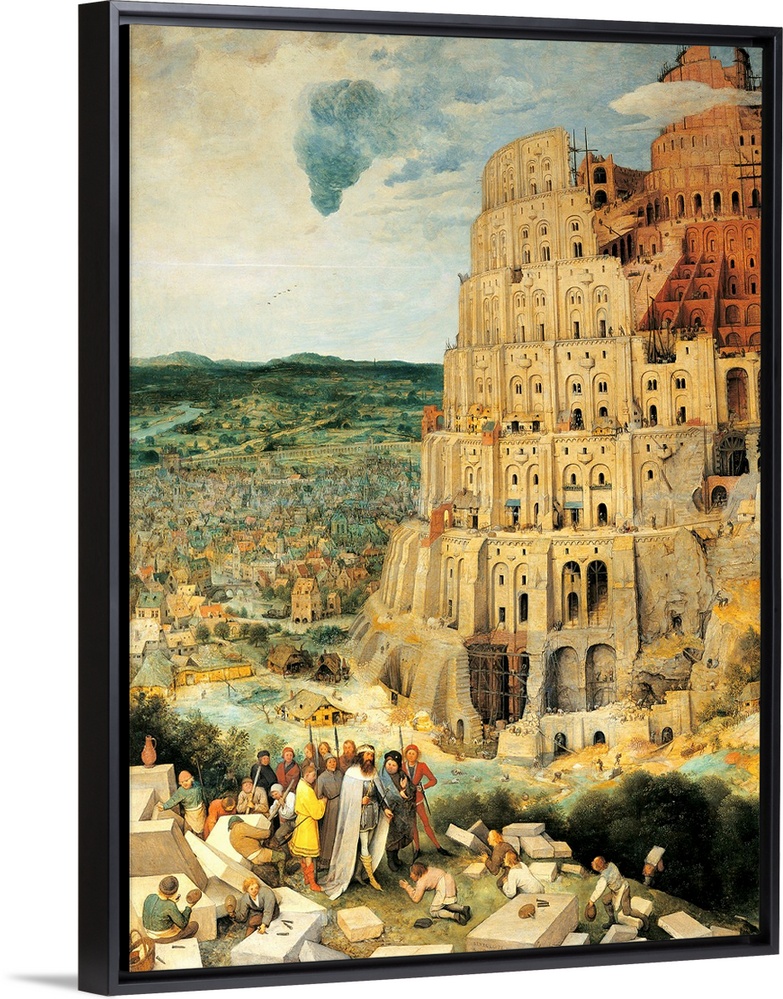<p>The Tower of Babel, by Pieter il Vecchio Bruegel, 1563, 16th Century, oil on panel, cm 114 x 155 - Austria, Wien, Kunsthistorisches Museum. Detail. Tower of Babel architectural construction building homes ruins blocks stones foreshortened figures landscap</p>