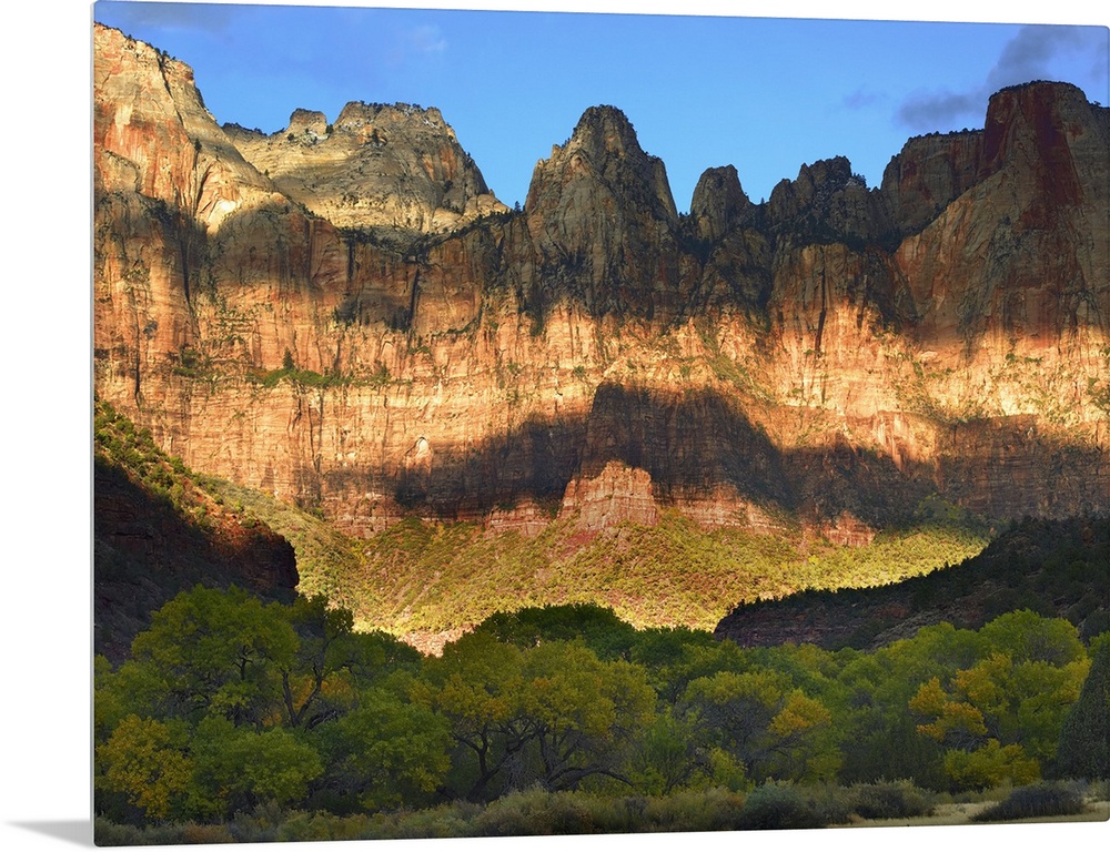<p>Picture taken of giant cliffs that have cloud shadows covering part of it and a line of trees on the ground in front.</p>
