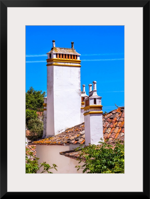 <p>Towers Chimnies Orange Roofs Medieval Town Obidos Portugal. Castle and walls built in 11th century after town taken from the Moors.</p>