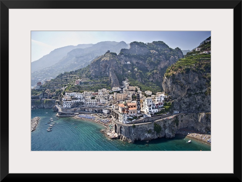 <p>Big canvas photo of a small town on cliffs and mountains that over look the ocean.</p>