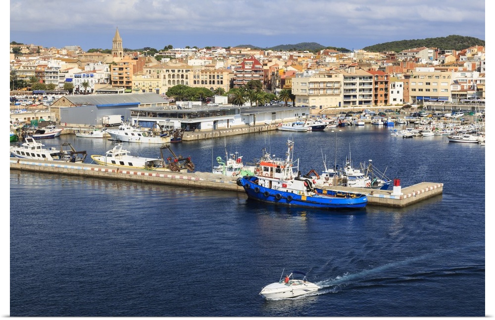 <p>Town centre, fishing boats and pleasure craft, from the sea, Palamos, Costa Brava, Girona, Catalonia, Spain, Europe</p>