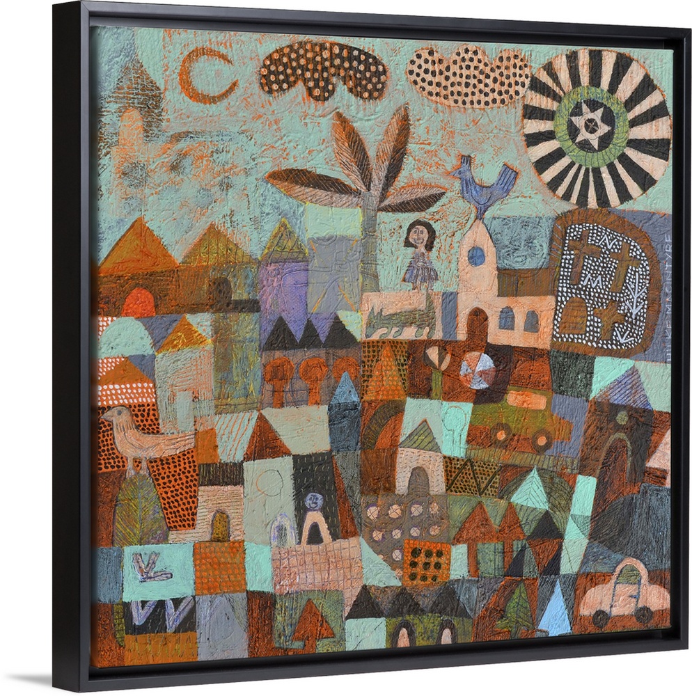 <p>Contemporary painting of a village with both the sun and moon in the sky.</p>