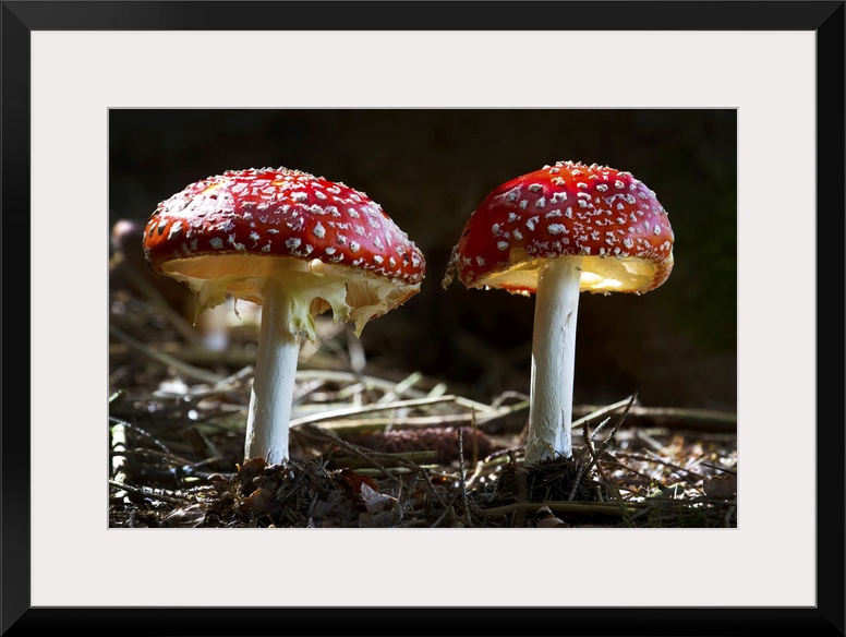 <p>Close-up of toxic mushrooms, amanita muscaria, dramatically illuminated by sunlight, Grainau, Bavaria, Germany.</p>