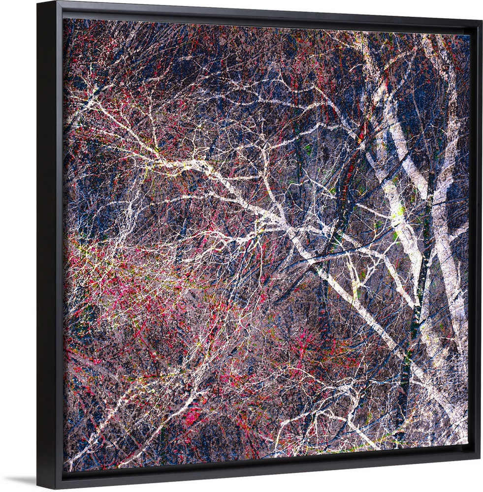 <p>Square photograph of a tree with a lot of thin branches manipulated with red, blue, green, and yellow hues.</p>