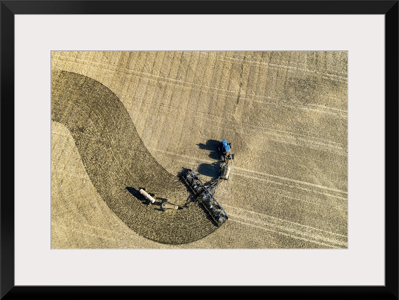 <p>Aerial view of a tractor pulling an air seeder, seeding a field; Beiseker, Alberta, Canada</p>