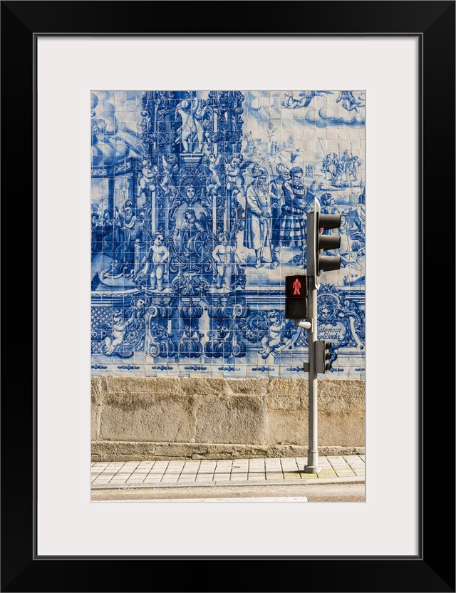 <p>Traditional azulejos hand-painted tiles covering the exterior wall of the Capela das Almas church in Porto, Portugal.</p>