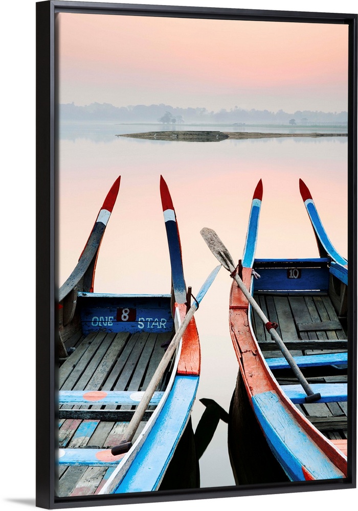 <p>Traditional Burmese boats at sunrise on Taungthaman Lake, Amarapura, Mandalay, Burma (Myanmar)</p>
