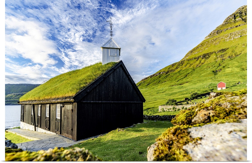 <p>Traditional church with grass roof overlooking the fjord, Funningur, Eysturoy Island, Faroe Islands, Denmark, Europe</p>