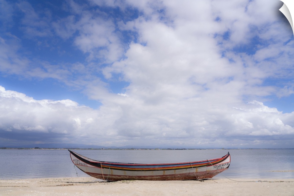 <p>Europe, Portugal, Torreira. Traditional fishing boat on beach.</p>