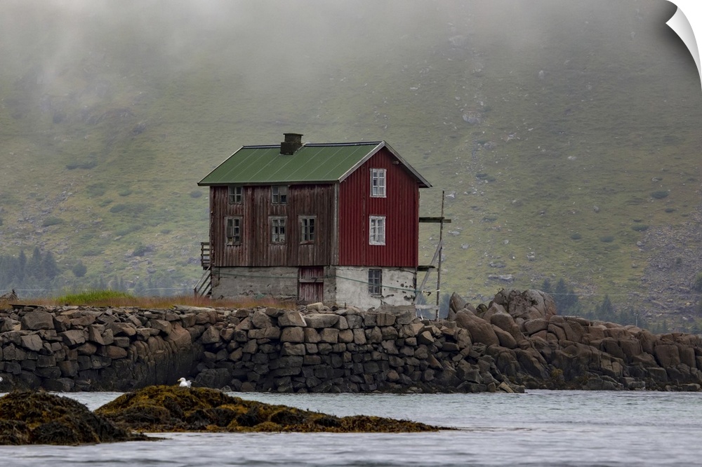 <p>Traditional fishing village house next to the shoreline in Lofoten, Lofoten, Arctic Circle, Norway</p>