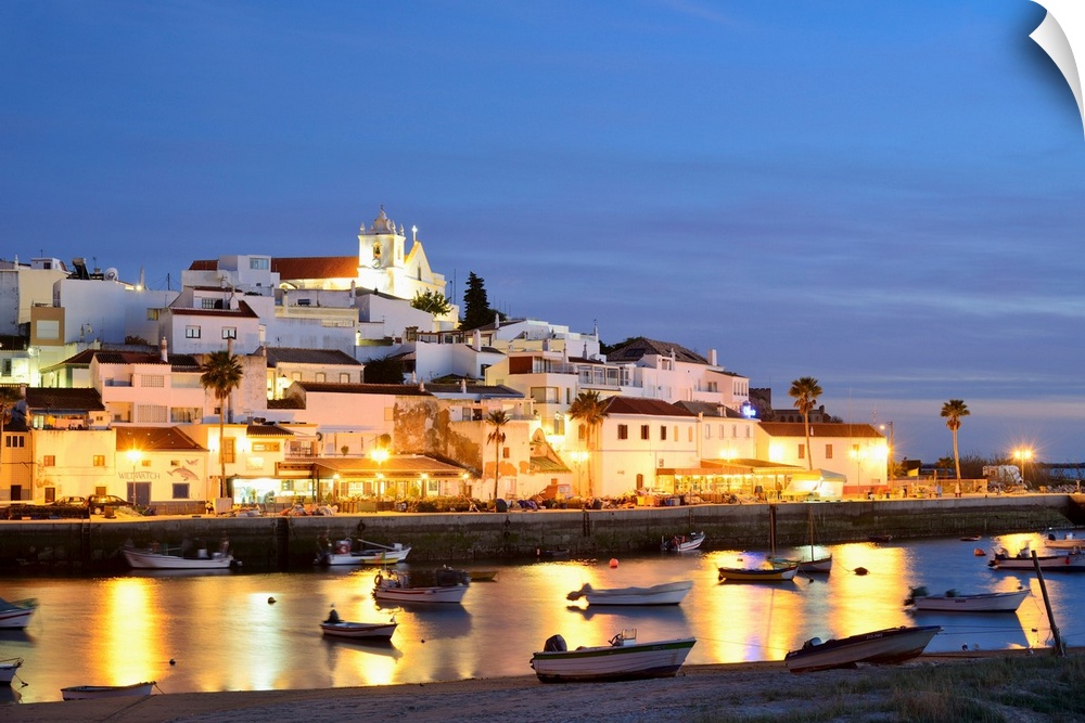 <p>The Traditional Fishing Village Of Ferragudo At Dusk, Bordering The Arade River. Algarve, Portugal</p>