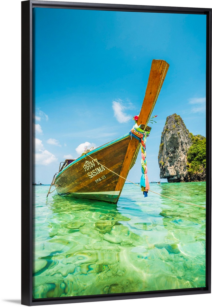 <p>Ao Nui (Nui Beach), Ko Phi Phi Don, Krabi Province, Thailand. Traditional Long Tail Boat Moored On Turquoise Waters.</p>