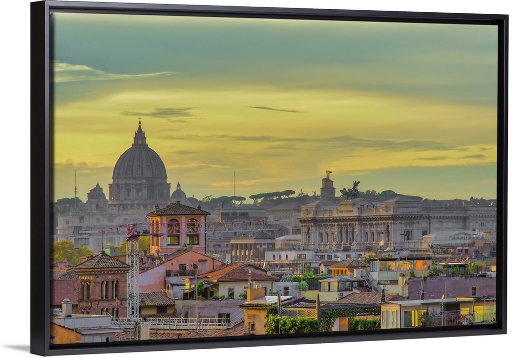 <p>Rooftops landscape panorama with traditional low-rise buildings and St. Peters Basilica dome, golden hour elevated view, Rome, Lazio, Italy, Europe</p>
