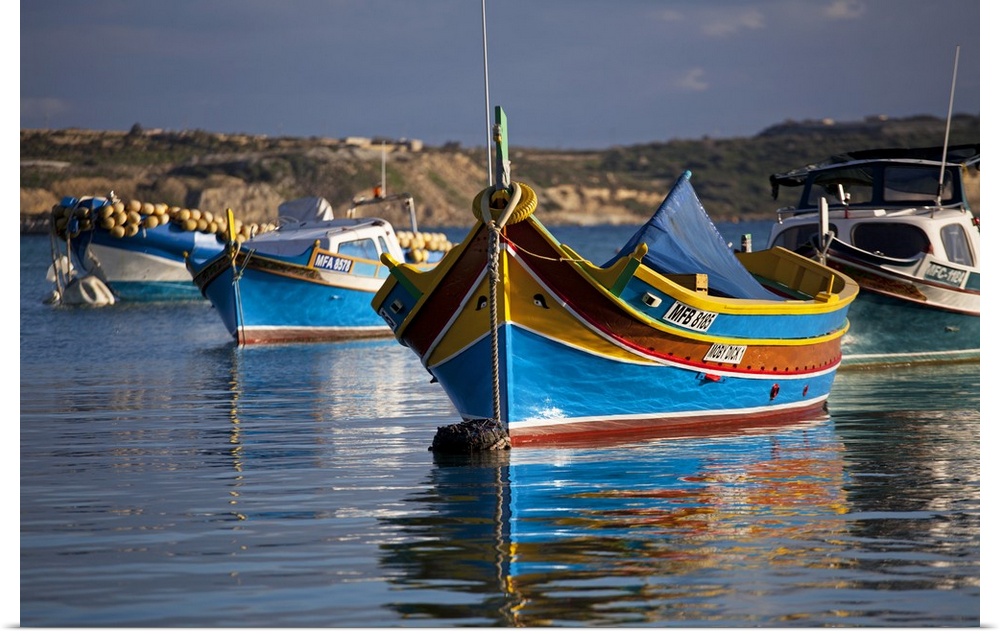 <p>Malta, Europe, Colourful traditional Maltese boats known locally as 'luzzu' in the village of Marsaxlokk which is still based around the fishing industry. The boats have two eyes in the bow which according to legend might represent those of the god Osiris to guard against tempests.</p>