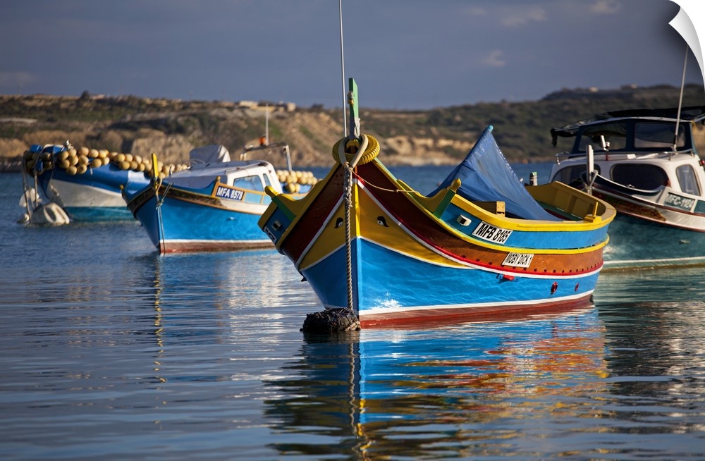 <p>Malta, Europe, Colourful traditional Maltese boats known locally as 'luzzu' in the village of Marsaxlokk which is still based around the fishing industry. The boats have two eyes in the bow which according to legend might represent those of the god Osiris to guard against tempests.</p>
