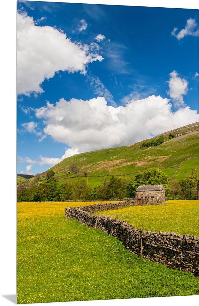 <p>Traditional meadows in Swaledale in early summer, covered in buttercups and wildflowers; Muker, North Yorkshire, England.</p>