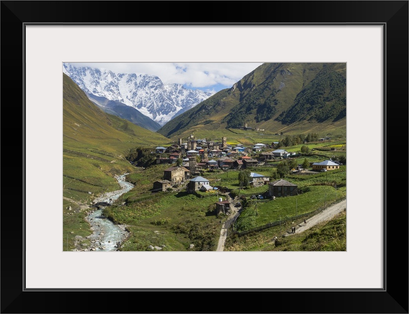 <p>Traditional medieval Svanetian tower houses, Ushguli village, Shkhara Moutains behind, Svaneti region, Georgia, Caucasus</p>