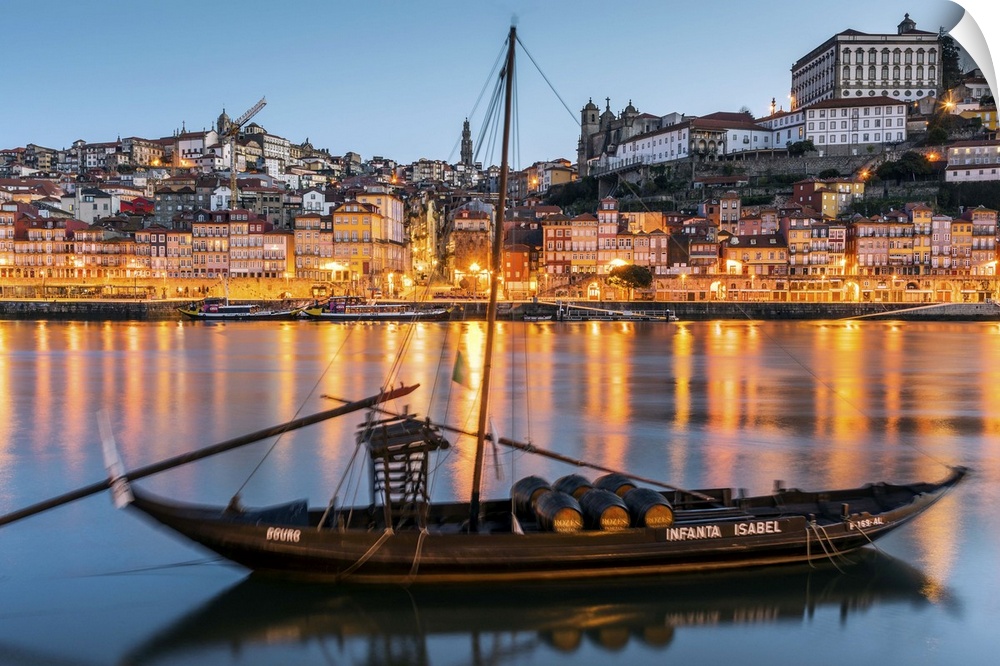 <p>Traditional Rabelo boat designed to carry wine down Douro river with city skyline behind, Porto, Portugal.</p>